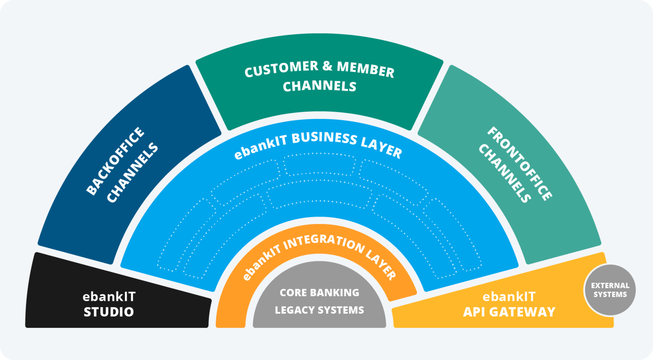 To further accelerate delivery, ebankIT has also developed custom regional layers containing functionalities specific to each country or to distinctive banking principles.